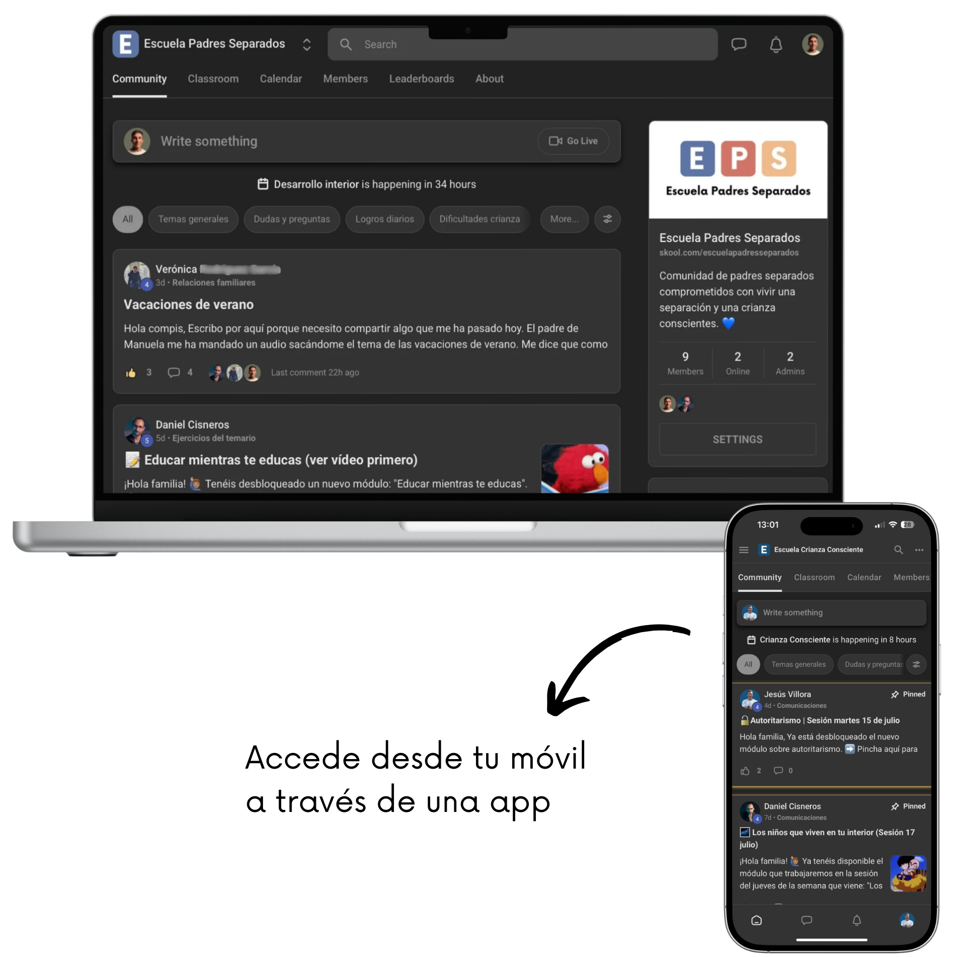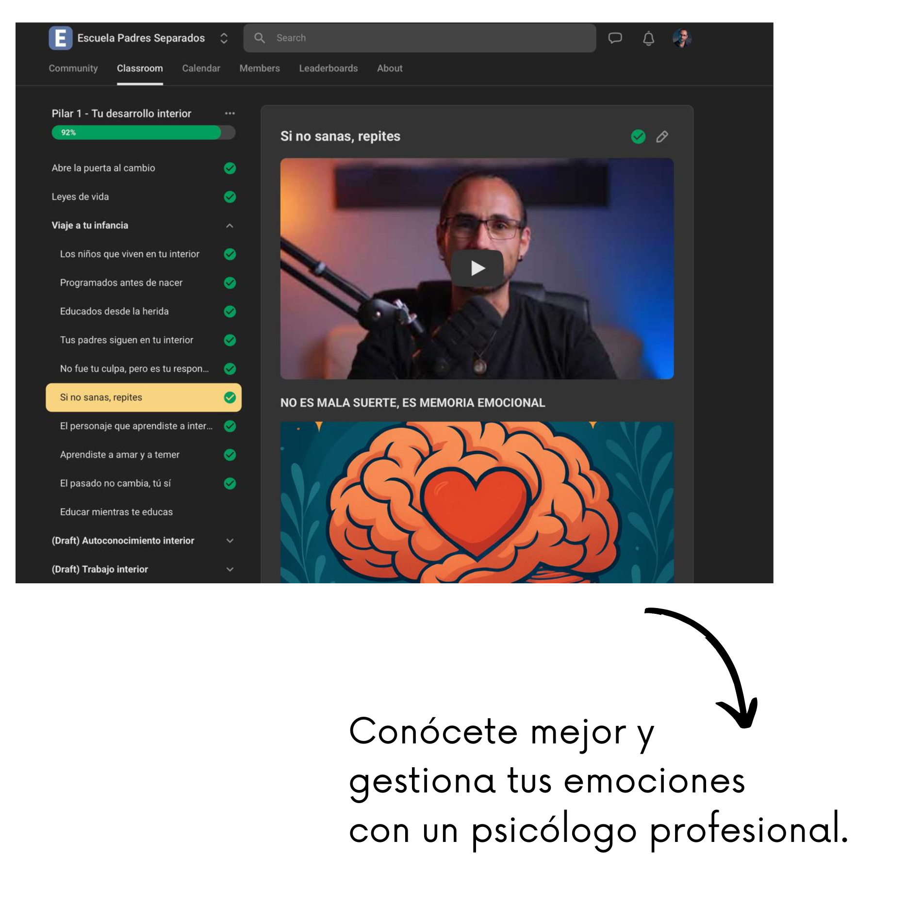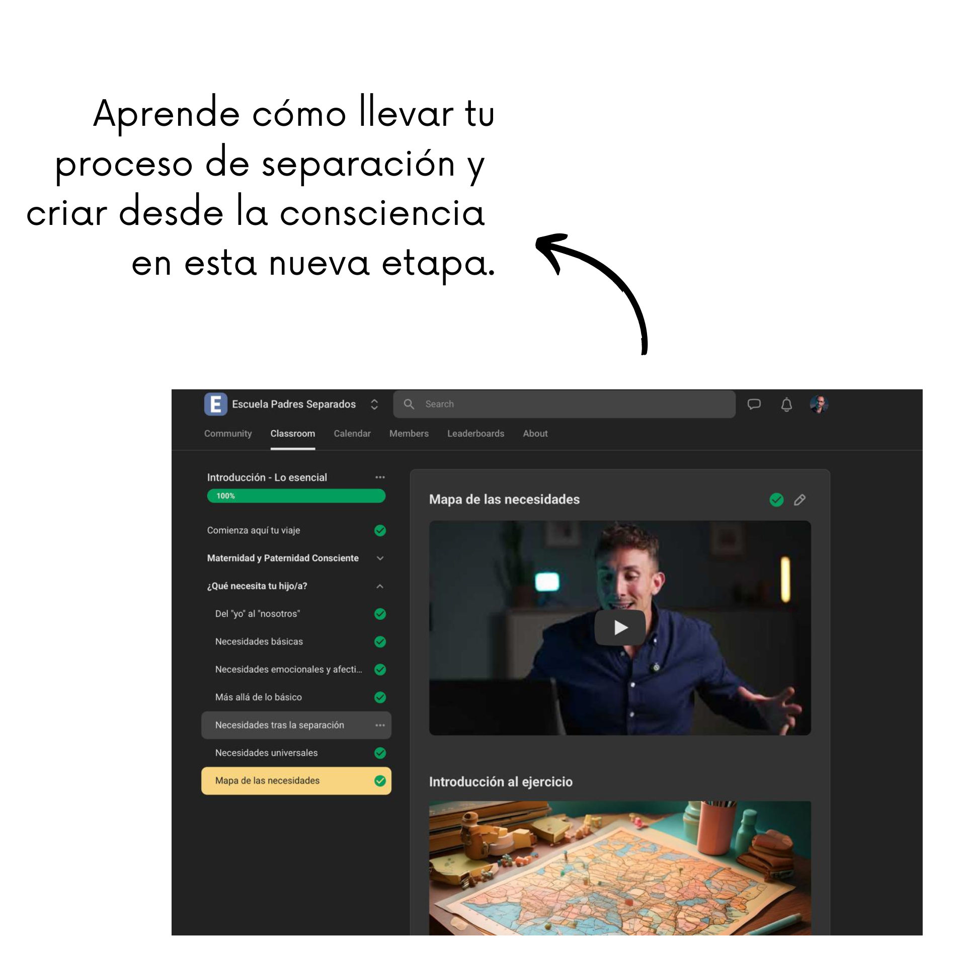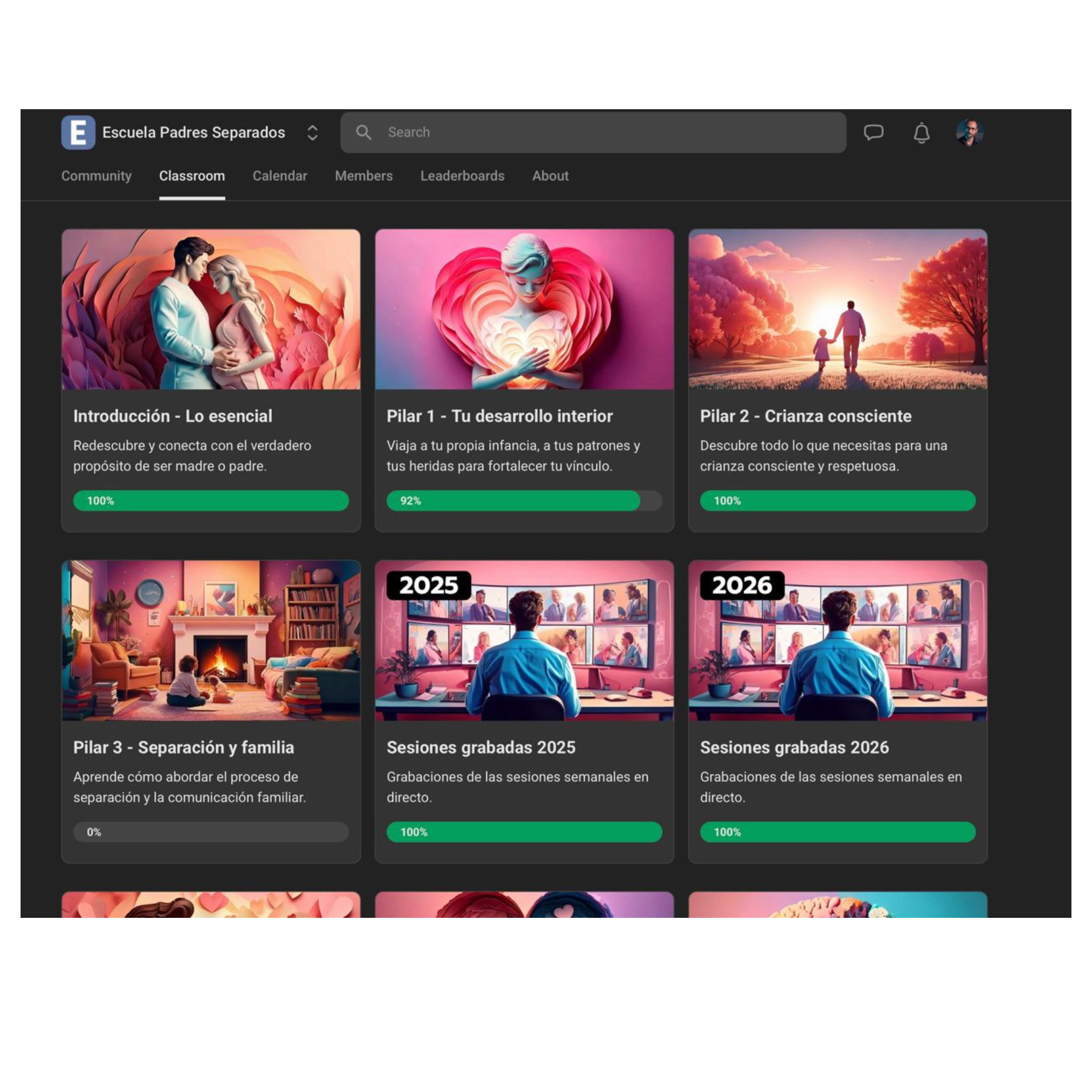 No es un curso. Es una comunidad formativa y de apoyo donde trabajamos 3 pilares: tu proceso emocional, la relación con tu expareja y la crianza de tus hijos en esta nueva realidad.